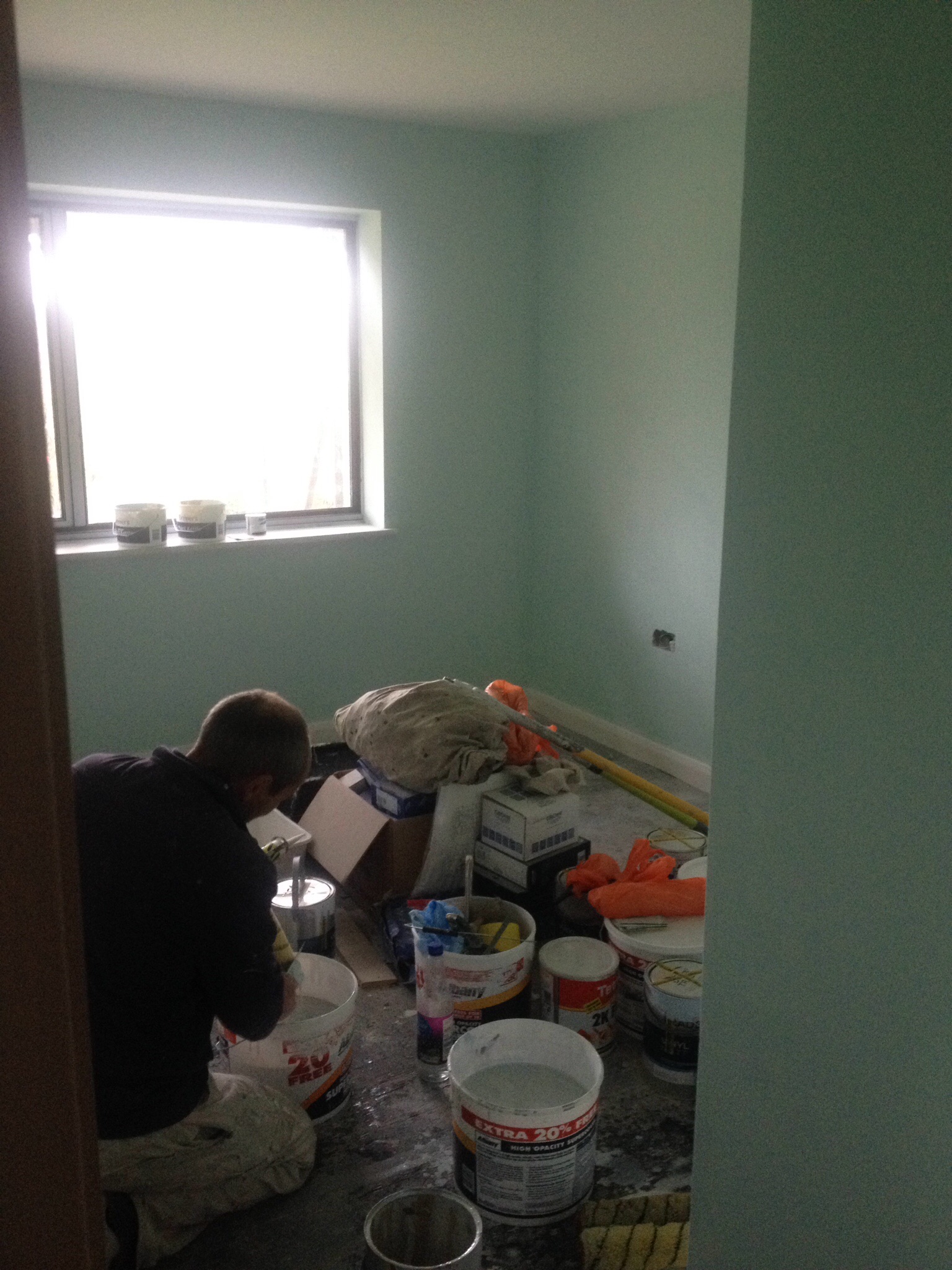 Having settled-upon colours, the decorator has been busy getting mist-coats and first coats on (this shot shows the light and mid-grey colours)…