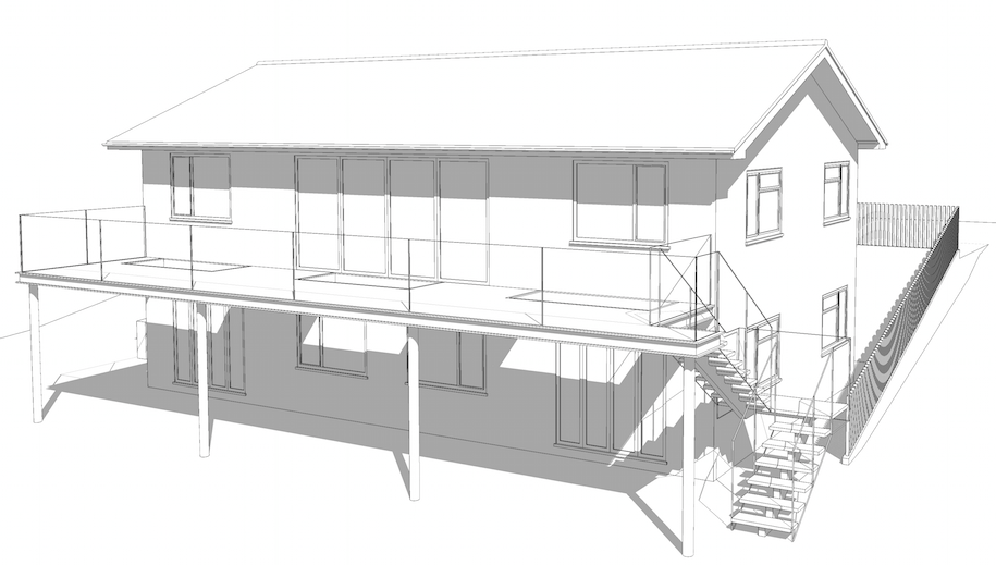 During the Detailed Design phase, we got some 3D piccies that we could zoom around using Google SketchUp. As you’ll notice, plans for the full-width balcony with outside stairs didn’t make the cut…