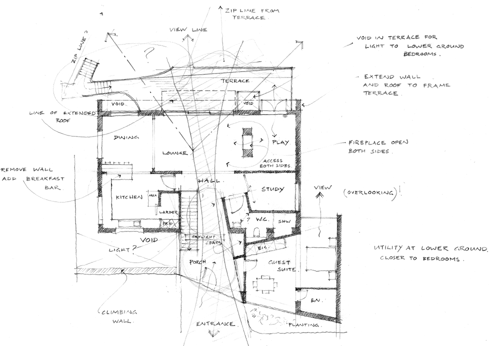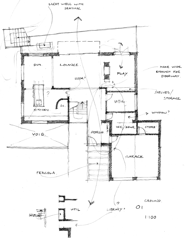By Christmas 2013 we’d decided to go with CDMS and the Stage AB Feasibility Report had been delivered (fond memories of poring over a beautifully bound hard-copy around the pool, courtesy of the Joyces in WA). This outlined three options in sketch, floor plan, elevation and axonometric form; here are some of the ground floor sketches…