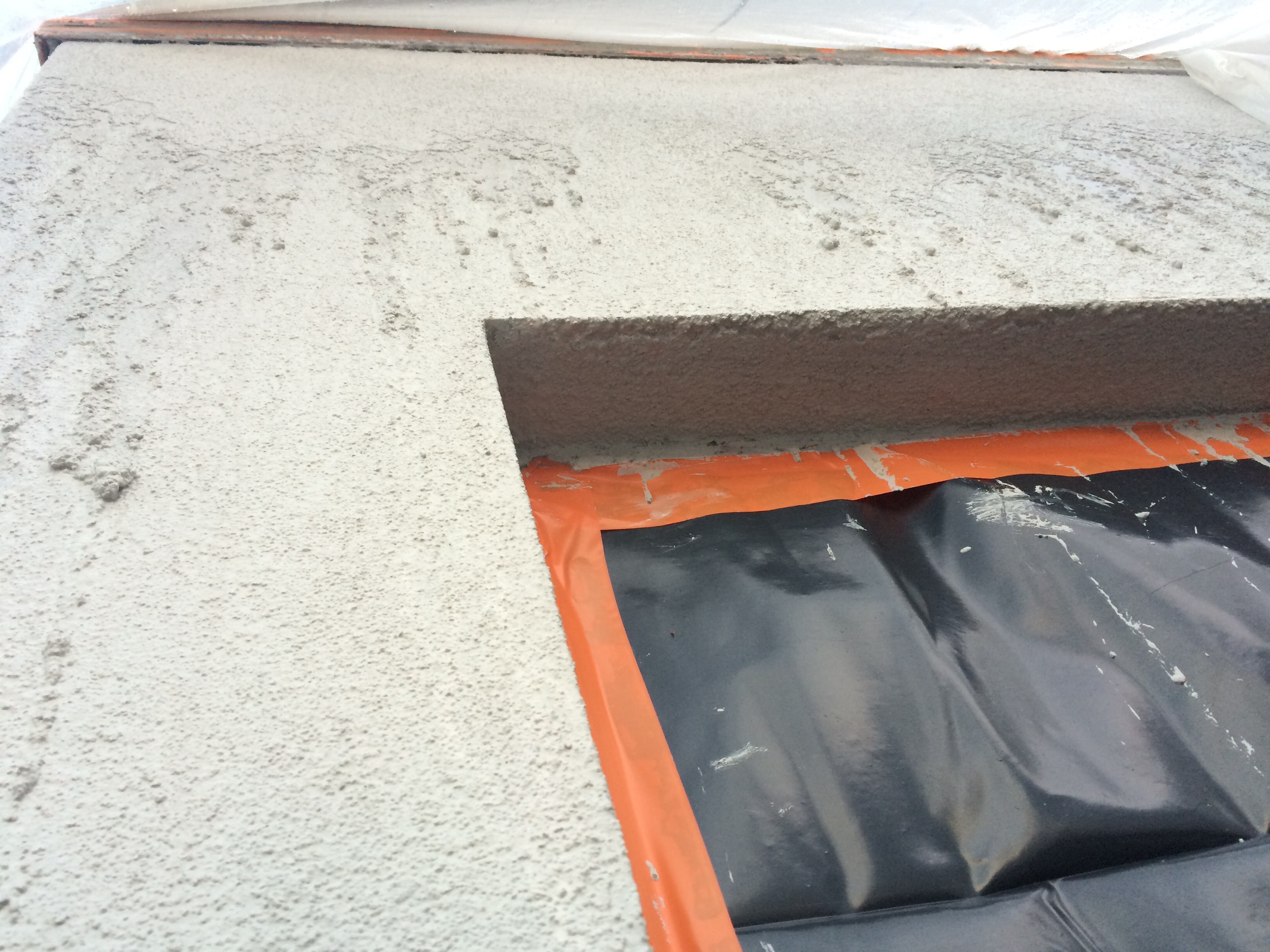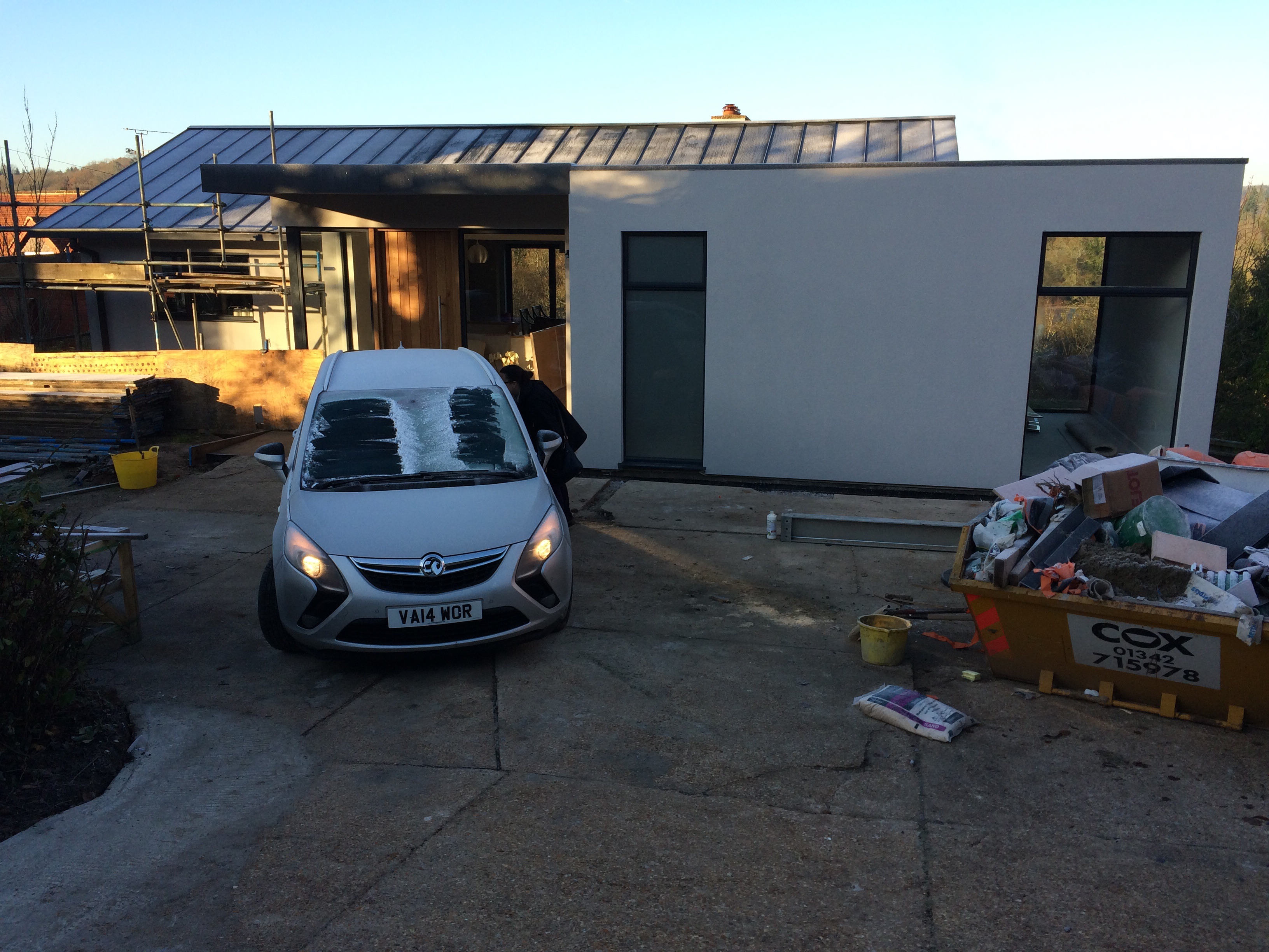 Why’s the scaffolding still up? Because of the issue with the render: Despite the team’s best efforts, the British winter conspired against the mix setting properly after it was reapplied on move-in day. Overnight rain led to the render on the north wall slumping: