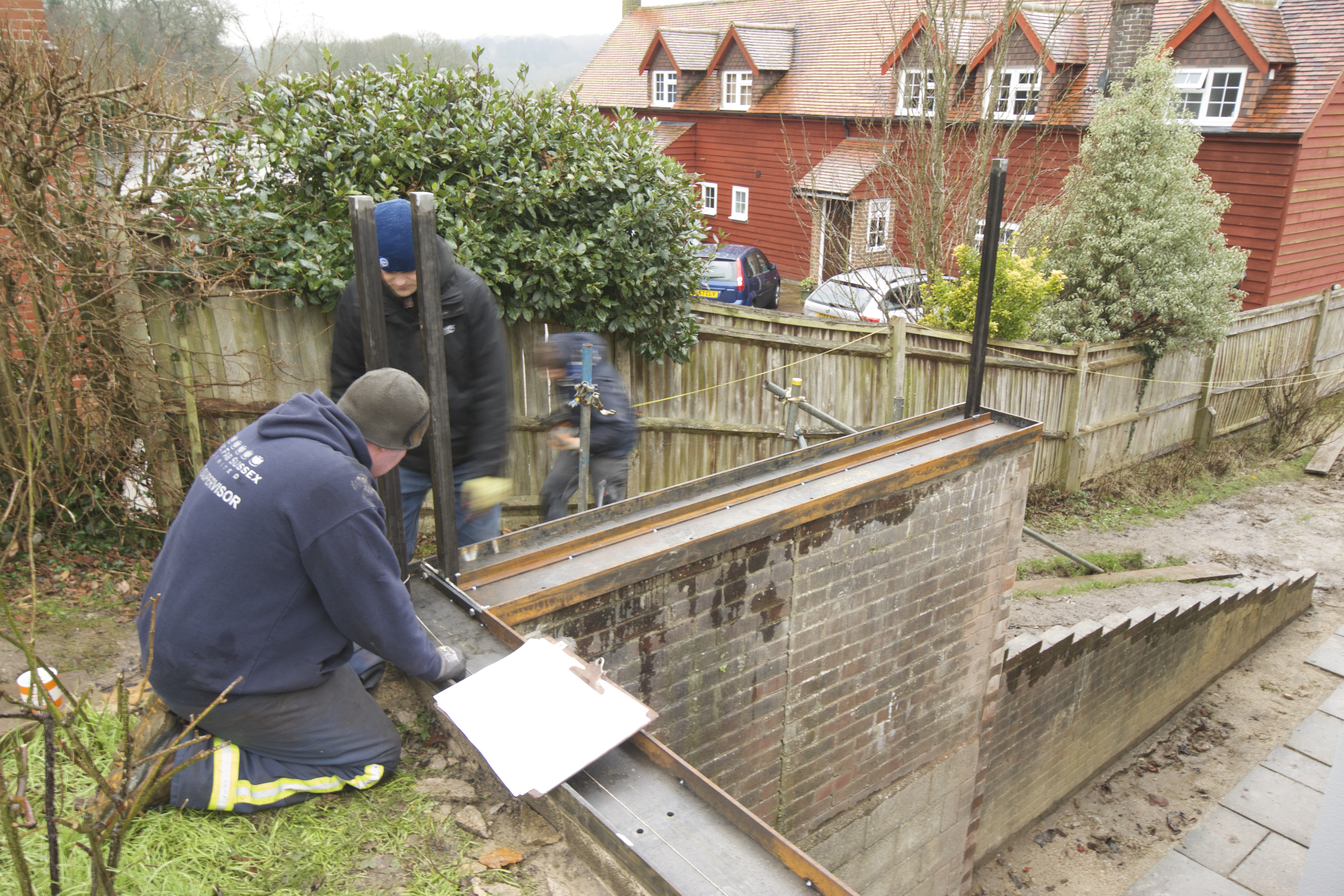 At the front, the dry-fit of the balustrades was completed on Thursday (subzero temperatures and sleet made for perfect conditions!). To prevent people/cars/dogs falling over the edge of the wall, new steel railings have been designed and are being custom-built at a local steelworkers. Three sections, each weighing 250Kg, will be lowered into position some time in the next couple of weeks. The dry-fit (without the full weight of all the railings) was required to make sure everything lined-up before the final adjustments were made. Holes were also drilled in the retaining wall so each section can be secured more easily on delivery day…