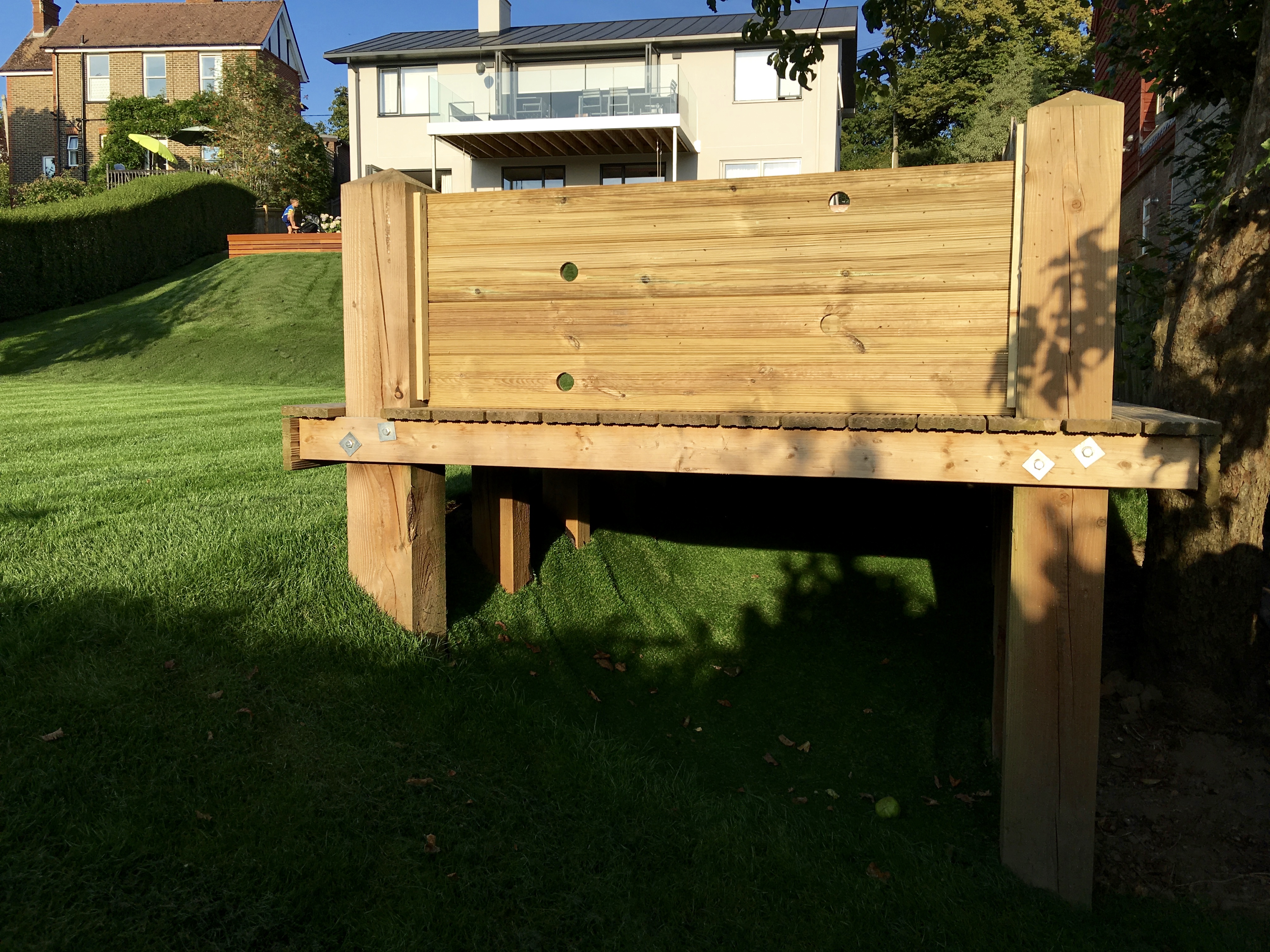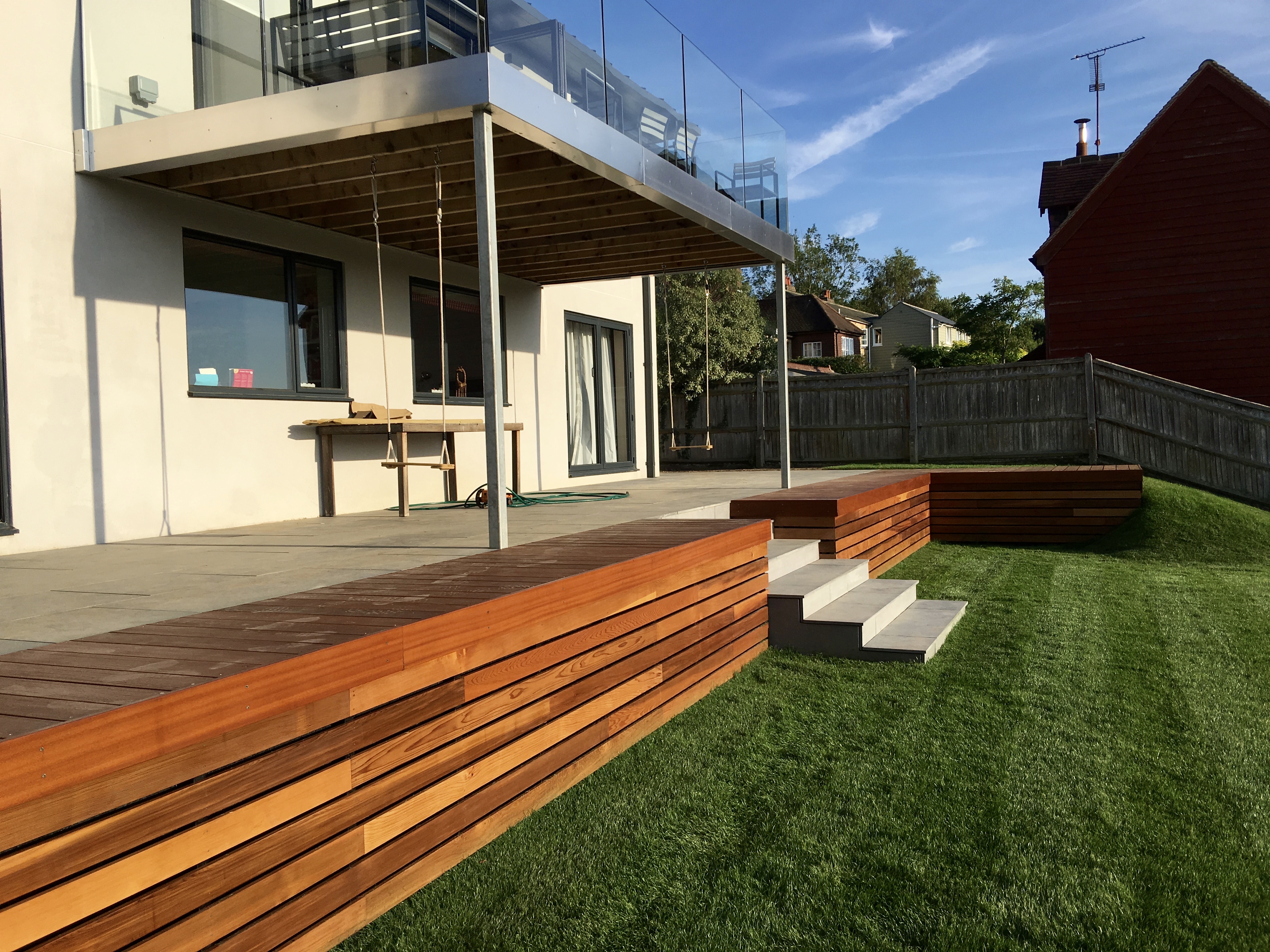 The cedar screen that disguises the old wall is a vast improvement and the extra decking gives more space around the house.